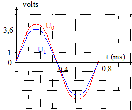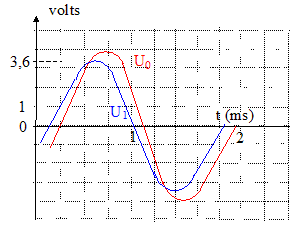 Détermination de l'inductance L de la bobine. On a relevé les enregistrements. Les enregistrements reproduits sur les figures ont été obtenus dans les mêmes conditions d'expérimentation, à l'exception d'un paramètre qui a varié. La fréquence du GBF a changé ( dans l'un des cas la période vaut 0,7 ms, dans l'autre elle vaut 1,8 ms) Les tensions relevées sont repérées par u0 et u1. La valeur maximale de la tension aux bornes du résistor ne peut pas être supérieure à la valeur maximale de la tension aux bornes du GBF : donc u1 correspond à la tension uR aux bornes du résistor. La tension aux bornes d'un résistor et l'intensité qui le traverse sont proportionnelles : u1 est l'image de l'intensité au facteur R près. u0 est la tension aux bornes du dipôle RLC. Lorsque u0 et u1 sont en phase (courbes non décalées) on observe le phénomène de résonance d'intensité. La fréquence du GBF vaut : 1/0,7 10-3 =