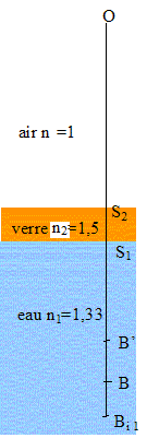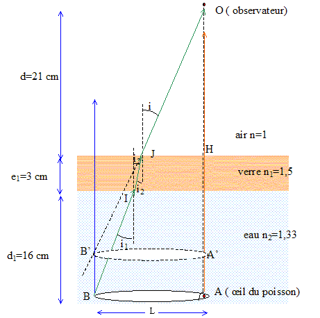 Un rayon lumineux issu de A, perpendiculaire à la surface séparant les milieux transparents n'est pas dévié : il frappe l'oeil de l'observateur. Un rayon issu de B, perpendiculaire à la surface séparant les milieux n'est pas dévié. L'image B'de B est vue par l'observateur, si un rayon issu de B frappe l'oeil O de l'observateur après réfraction. B' image de B, est à l'intersection des deux rayons réfractés ( ou de leurs prolongements), issus de B. D'après le schéma l'image du poisson a la même taille que le poisson, mais elle est plus proche du verre. Position de B' image de B : réfraction en I ; la loi de Descartes s'écrit : 1,33 sin i1 = 1,5 sin i2. réfraction en J ; la loi de Descartes s'écrit : 1,5 sin i2 = 1 sin i. d'où