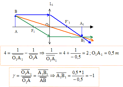 Un objet AB ( hauteur 1 cm ) est placé 50 cm devant une lentille mince convergente ( f'1 = 25 cm=0,25 m; vergence =1/0,25 =4 dioptries= 4 d). AB est perpendiculaire l'axe otique principal. position de l'image et grandissement transversal : A1B1 image de AB