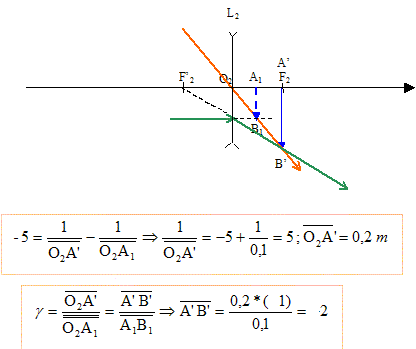 position de l'image définitive et grandissement transversal : A1B1 joue le rôle d'objet pour L2 ; l'image définitive est A'B'. O2A1=O2O1+O1A1 =-0,4 +0,5 = 0,1 m ( distance algébrique )