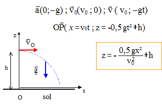 Lavion vole en palier à laltitude de 800 m et à vitesse constante de 70 m.s-1 sur une trajectoire rectiligne. Un petit objet (sur lequel on peut négliger linfluence de la résistance de lair) se détache du dessous de lavion. Allure et équation de la trajectoire de lobjet par rapport à un repère terrestre : Origine des temps et des abscisses : la verticale de l'avion au moment où l'objet est laché. z= -0,5*10/702x2+800 = -0,0010 x2+800 Allure et équation de la trajectoire de lobjet par rapport à un repère lié à lavion : chute libre verticale sans vitesse initiale : origine des temps et de l'axe vertical descendant : l'avion au moment du laché) z = ½gt2= 5t2. La trajectoire est un segment de