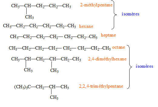 "craquage catalytique " : ruptures des longues chaînes carbonées des produits dits "lourds". Ces derniers passent dans un four dont la température est comprise entre 400 et 600°C. Ce four ne contient pas d'oxygène. Les catalyseurs utilisés sont : chrome ; SiO2, Al2O3. " reformage " : obtention d'hydrocarbures à chaînes ramifiées à partir d' hydrocarbures à chaînes linéaires.( P = 20 à 50 bars , T = 500 °C , catalyseur AlCl3). Par alkylation, lisooctane est obtenu à partir du 2-méthylpropane dont une partie est transformée en 2-méthylpropène, ces deux corps réagissant entre eux. Les différentes réactions conduisant à l'isooctane à partir du 2-méthylpropane sont : * déshydrogénation du 2-méthylpropane en présence d'acide sulfurique :