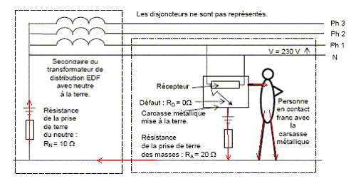 Calcul de la différence de potentiel V entre la carcasse du récepteur et la masse : Le courant de fuite traverse la prise de terre et le corps de la personne (bien que la résistance soit trèsgrande par rapport à celle de la prise de terre). 230 = (RA+RN) i ; V = RA i soit V = 230 RA/(RA+RN) = 230*20/30 = 153 V. la personne est en grand danger.
