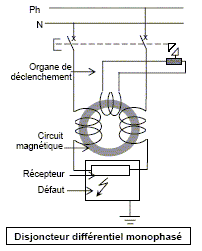 En absence de défaut, les deux bobines sont parcourues par la même intensité : lexcitation magnétique est nulle et en conséquence il n'y a pas de f.e.m induite dans la bobine du circuit de déclenchement. Il n'y a pas de déclenchement. En présence de défaut, les deux bobines sont parcourues par des intensités différentes : lexcitation magnétique n'est pas nulle et en conséquence il y a une f.e.m induite dans la bobine du circuit de déclenchement. Il y a déclenchement si l'intensité du courant traversant cette bobine de déclenchement atteint une valeur suffisamment importante. Ce système assure une bonne protection si la résistance de la " terre " est faible ; sinon lexcitation magnétique n'est pas assez grande pour induire une intensité assez importante dans la bobine de déclenchement. On relève sur deux disjoncteurs différentiels différents les indications "30mA " et " 500mA ". Il s'agit des courants de fuite induisant le déclenchement. Le disjoncteur le mieux adapté à la protection des personnes est "30 mA" : valeur sans danger pour une personne, mais suffisante pour induire un déclenchement. |