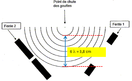 l = 3,8 / 6 = 0,633 cm puis tenir compte de l'échelle : l =0,6333*8 = 5,066 ~ 5,1 cm ~ 5,1 10-2 m Célérité V' = l f = 5,066 10-2 * 1,967 =9,97 10-2 ~0,10 m/s.