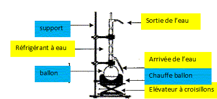 Mettre dans le ballon : 100 mL de solution aqueuse de soude à 0,40 mol/L ; 2,5 mL d'alcool benzylique ; 4,5 g de permanganate de potassium ; quelques grains de pierre ponce. Réaliser un chauffage à reflux et chauffer à ébullition douce pendant 30 min. Il apparaît un précipité marron de dioxyde de manganèse MnO2. L'équation de la réaction notée (1) s'écrit : 3 C6H5CH2OH aq + 4 MnO4- aq = 3 C6H5CO2- aq + 4 MnO2 (s)+ HO- aq + 4 H2O(l). Après refroidissement, filtrer le mélange à l'aide d'un filtre büchner : le filtrat obtenu est incolore. Verser le filtrat dans une ampoule à décanter, y ajouter environ 40 mL de cyclohexane, agiter et dégazer plusieurs fois, laisser reposer : on recueille la phase contenant le benzoate de sodium en solution. Annoter le schéma du montage à reflux.