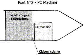 Le local des groupes électrogènes se trouve sur le pont n°2, contigu à la salle de commande des machines ( PC machine). Le cahier des charges impose un niveau sonore dans la salle PC machine inférieur à 57 dB.