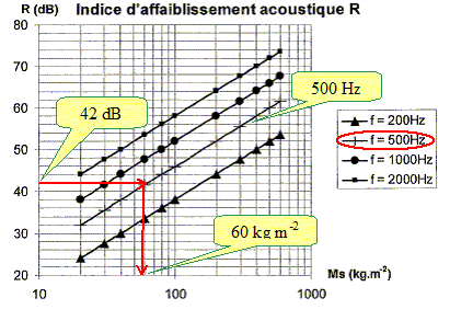 L'étude porte sur l'isolation acoustique entre ces deux salles, l'objectif étant de déterminer l'épaisseur de la cloison isolante. On supposera que la transmission des bruits entre les deux locaux ne se fait que par cette paroi séparative supposée simple et homogène. Le local des groupes électrogènes comporte deux groupes Diesel alternateur. Chaque groupe émet un niveau sonore Ng= 95 dB. Le niveau sonore du au bruit ambiant, Nb, hors groupe diesel alternateur, est égal à 92 dB. La fréquence moyenne mesurée est égale à 500 Hz. Déterminer le niveau sonore total Nt dans le local des groupes électrogènes : intensité acoustique : I = I0 10 N/10 Pour un groupe : Ig = 10-12 * 109,5 = 10-2,5 = 3,16 10-3 W m-2. Bruit ambiant : Ib = 10-12 * 109,2 = 10-2,8 = 1,58 10-3 W m-2. Les intensités acoustiques s'ajoutent : It = 2 Ig + Ib = (2*3,16 + 1,58) 10-3 = 7,9 10-3 W m-2. Nt = 10 log (It/I0). Nt = 10 log(7,9 10-3/10-12) = 99 dB. En déduire la valeur minimum de l'indice d'affaiblissement R de la cloison isolante pour respecter le cahier des charges : R= Nt-57 = 99-57 = 42 dB. En vous aidant de la caractéristique ci-dessous, déterminer la masse surfacique Ms de la cloison isolante.