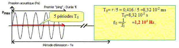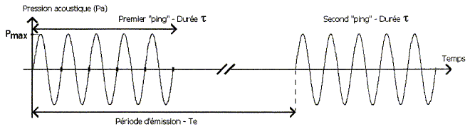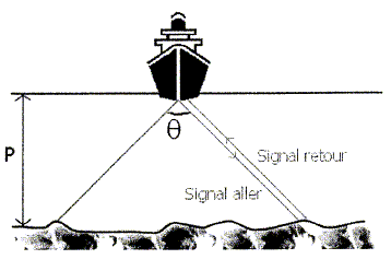 Le principe de la mesure consiste à emettre une onde sonore de forte amplitude en direction des fonds sous-marins. L'onde se propage avec une sélérité c= 1500 m/s jusqu'au fond de l'eau puis elle est renvoyée par réflexion. Dans le cas où l'ouverture angulaire q est égale à 150 °, la valeur de la durée de propagation de l'onde pour réaliser l'aller et le retour est égale à ta,r = 18,03 s. Dans la majorité des sondeurs bathymétriques, l'onde émise est une impulsion monochromatique (" ping" ) constituée d'une sinusoïde de fréquence f0 émise durant un temps t. ( dans ce cas t =0,416 ms).