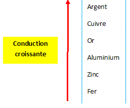Les métaux les plus couramment utilisés sont le fer, le zinc, l'aluminium, le cuivre, l'argent et l'or. Tous les métaux conduisent le courant électrique. On peut classer les métaux par conduction croissante.