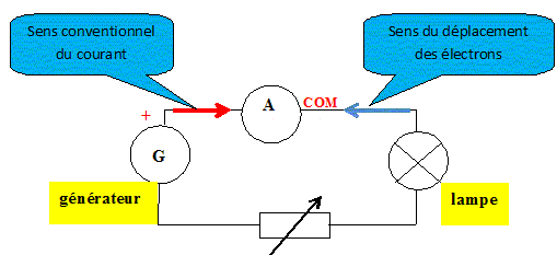 Les métaux contiennent des électrons " libres" : ceux-ci peuvent se déplacer dans le métal. En appliquant une tension électrique entre deux points d'un métal, ces électrons libres se déplacent tous dans le même sens : on dit " le courant électrique est dû à ce mouvement d'ensemble, ordonné des électrons libres". Ce déplacement des électrons s'effectue en sens contraire du sens conventionnel du courant.