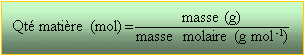 diviser 189 000 gramme par 180 = 1050 mol de glucose étape 2 : écrire l'équation bilan de la réaction 1 C6H12O6 donne 2 C2H5OH + 2 CO2 utiliser les coefficient de l'équation bilan pour trouver la qté de matière d'alcool éthylique en moles. 2*1050=2100 mol étape 3 : masse de l'alcool éthylique multiplier le résultat précédent par la masse molaire de l'alcool éthylique C2H5OH soit 46 g mol-1 d'où : 96 600g d'alcool utiliser la masse volumique de l'éthanol : 790 kg m-3 = 0,79 g / mL diviser la masse d'alcool par 0,79 d'où un volume en mL d'alcool 96 600/0,79 =1,223 105 mL ou 122,3 L d'éthanol dioxyde de carbone à partir de 1050 mol de glucose, utiliser les coefficients de l'équation bilan pour trouver la quantité de matière de CO2 en mol 2*1050 =2100 mol multiplier ce résultat en mol par le volume molaire d'un gaz (22,4 L / mol en général ou la valeur que l'on vous donne); d'où le volume de CO2 en litres. 2100*22,4 =47000 L ou 47 m3 Le volume d'air doit être 10 fois plus grand.(470 m3)