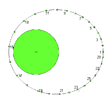 Le document ci-dessous représente la simulation du mouvement d'un satellite artificiel de la Terre (dans le référentiel géocentrique). La position du satellite sur son orbite a été calculée toutes les 500s. ![]()