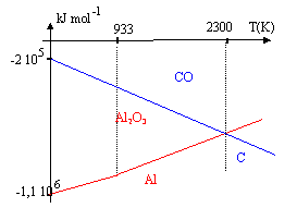 corrigé 4/3 Al + O2 = 2/3 Al2O3.(1) sur l'intervalle [250 K, 933 K] : DH01= 2/3 DH0(Al2O3)- 4/3DH0(Al)-DH0(O2 )= -1116 kJ mol-1. DS01= 2/3S0(Al2O3)- S0(O2)-4/3S0(Al)= 34-205-37,3 = -208,3 J K-1 mol-1. DG01 = -1 116 000 + 208,3 T. sur l'intervalle [933 K, 2500 K] DH01= 2/3 DH0(Al2O3)- 4/3[DH0(Al)+ Dfusion H°(Al)]-DH0(O2 ) DH01= -1116 -4/3* 10,9 = -1130,5 kJ mol-1. entropie de changement d'état à 933 K : S= Dfusion H°(Al) / Tfusion = -10900 / 933= 11,7 J K-1 mol-1. DS01= 2/3S0(Al2O3)- S0(O2)-4/3[S0(Al)+11,7]= 34-205-53 = -224 J K-1 mol-1. DG01 = -1 130 500 + 224 T. 2C+O2 = 2CO (2) DH02=2 DH0(CO)-2 DH0(C)-DH0(O2)= -220 kJ mol-1. DS02=2 S0(CO)-2 S0(C)-S0(O2)= 177 JK-1 mol-1. DG0=DH0-T DS0 DG02= -220 000 - 177 T Le cabone peut réduire l'alumine si l'enthalpie libre de la réaction suivante est négative : 3C+ Al2O3 = CO + 2Al obtenue à partir de 1,5 *(2) -1,5 (1) DG0= 1,5(DG02 - DG01) pour trouver la température à partir de laquelle cette réduction est possible , écrire que DG0 =0 soit DG02= DG01; -1 130 500 + 224 T= -220 000 -177 T T= 910500/ 401 = 2270 K. température trop élevée pour que cette méthode soit bon marché ; la préparation de l'aluminium se fait par électrolyse.