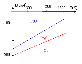 A diverses températures T, on relève les valeurs correspondantes des enthalpies libres standard DrG0 (DrHG0 et DrSG0 seront considérées indépendantes de T ) relatives aux réactions d'obtention des oxydes de cuivre (I) et (II) : Cu2O (réaction 1) et CuO (réaction 2). ( les réactions ne font intervenir qu'une mole de dioxygène ).
