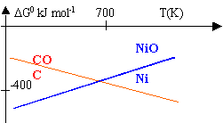 DH01=2 DH0(CO)-2 DH0(C)-DH0(O2)= -221 kJ mol-1. DH02=2 DH0(NiO)-2 DH0(Ni)-DH0(O2)= -488,6 kJ mol-1. DS01=2 S0(CO)-2 S0(C)-S0(O2)= 178,8 J mol-1. DS02=2 S0(NiO)-2 S0(Ni)-S0(O2)= -188,8 J mol-1. DG0=DH0-TDS0 DG01 = -221 000 -178,8 T DG02= -488 600 + 188,8 T