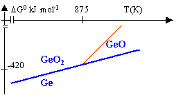 DH01=2 DH0(GeO)-2 DH0(Ge)-DH0(O2)= -510 kJ mol-1. DH02=2 DH0(GeO2)-2 DH0(GeO)-DH0(O2)= -594 kJ mol-1. DS01=2 S0(GeO)-2 S0(Ge)-S0(O2)= -101 J mol-1. DS02=2 S0(GeO2)-2 S0(GeO)-S0(O2)= -197 J mol-1. DG0=DH0-TDS0 DG01 = -510 000 +101 T DG02= -594 000 + 197 T