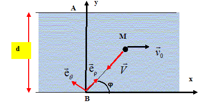Traversée d'une rivière. Un chien quitte le point A, situé sur la rive, et se dirige vers son maître, situé en B ; A et B sont directement opposés. La vitesse V du chien a un module constant et est toujours dirigée vers B. La vitesse v0 du courant est constante, parallèle aux rives.