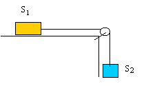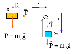 La masse de la poulie étant négligeable, les deux solides ont la même accélération et les tensions sont identiques. écrire la seconde loi de Newton : pour S1 suivant l'axe x : T=m1a pour S2 suivant l'axe z : -T+m2g=m2a ; T = m2(g-a) m1a =m2(g-a) d'où a = m2g / (m1+m2).