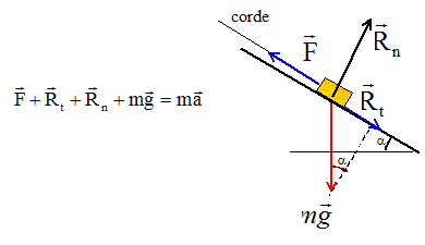 Question relative à Rn perpendiculaire au plan. Ecrire la seconde loi de Newton suivant un axe perpendiculaire au plan : -mg cos a + Rn = 0 ; Rn = mg cos a. A.N : m =40 kg ; a = 30° ; Rn = 40*10*cos 30 = 346 N. Question relative à F ou à l'acélération a. Ecrire la seconde loi de Newton suivant un axe parallèle au plan : F - mg sin a -Rt = ma. a = (F-Rt ) / m -g sin a. F = Rt + m(a+g sin a). si F = 500 N alors a =(500-100)/40 -10 sin 30 =