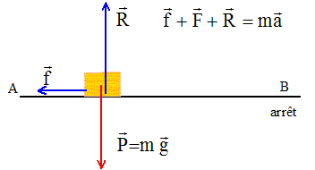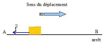 Le poids et l'action normale du plan sont perpendiculaires la vitesse : ces forces ne travaillent pas entre A et B. Travail résistant de la force de freinage entre A et B : W=-f AB Question relative à l'accélération. accélération : a = Dv/Dt = (0-v0 ) / Dt =-5/14,3 = -0,35 m/s². Question relative à la valeur de force f. Ecrire la seconde loi de Newton sur un axe horizontal orienté dans le sens du mouvement : -f = ma ; f =400*0,35 = 1,4 102 N. Question relative à la distance AB d'arrêt. Ecrire le théorème de l'énergie cinétique entre A et B : 0-½mv02 = -f AB = m a AB AB = v02 /(-2a) ; AB = 52/ 0,70 = 36 m.