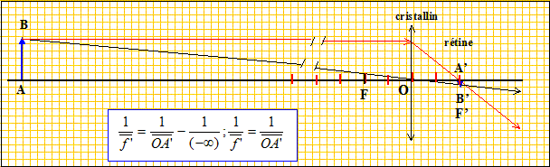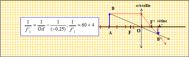 60 = 1/OA' ; OA' = 1/60 = 1,67 10-2 m = 1,67 cm. La distance cristallin -rétine est constante et vaut 1/60 = 1,67 10-2 m. Question relative à l'observation à 25 cm. La distance focale du cristallin diminue ; l'image nette se forme sur la rétine.