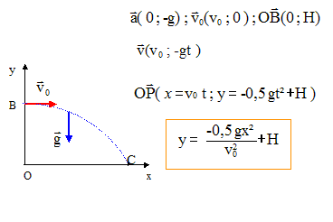 Question relative à la distance OC. Au point C, y=0 soit xC2 = 2v02H/g. xC2 =2*15,82*2/10 = 100 ; xC= 10 m. Question relative à la durée de la chute. xC = v0t ; t = xC / v0 = 10/15,8 =0,63 s. ou bien : yC=0 ; -0,5g t2+H=0 ; t2=2H/g ; t = (2H/g)½ = (2*2/10)½ =0,63 s.