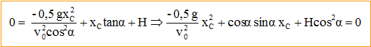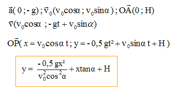 Texte : v0 = 57 km/h ; OB = H = 2,0 m ; on néglige les frottements. Analyse : Question relative à l'équation de la trajectoire. Exprimer v0 en m/s : v0 =57/3,6 = 15,8 m/s.