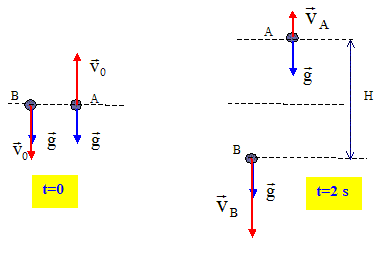 On choisit un axe vertical orienté vers le haut, ayant pour origine la position initiale de A ou B. Les frottements sont négligés. Analyse : Question relative aux équations horaires. A : vitesse initiale v0 ; accélération (-g) ; position initiale y0=0. à la date t : vA = -gt + v0 ; yA = -½gt2 +v0t. B : vitesse initiale -v0 ; accélération (-g) ; position initiale y0=0. à la date t : vB = -gt - v0 ; yB = -½gt2 -v0t. Question relative à H. H = |yA-yB| =2 v0t. Si v0 = 20 m/s et t=2 s alors H =80 m.
