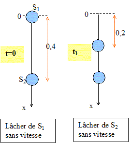 On néglige les frottements. g = 10 m/s2. Analyse : Question relative à la date t1. On choisit l'origine des dates au moment du lâcher de S1. La distance parcourue par S1 est : x1 = ½gt2 = 5 t2. 0,2 = 5 t12 soit t1 = (0,2/5)½ = 0,2 s. Question relative à la date de la rencontre. La distance parcourue par S2 est : x2 = ½g(t-0,2)2 +0,4= 5 (t-0,2)2 +0,4. x1 = x2 ; 5 t2=5 (t-0,2)2 +0,4 ; t2- (t-0,2)2 =0,4 /5 = 0,08. (2t-0,2)*0,2 =0,08 ; t = 0,3 s.