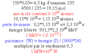 La fission d'un noyau d'uranium 235 libère en moyenne une énergie de 200 MeV. Un réacteur nucléaire fournit une puissance de 1300 MW. Le rendement de la transformation d'énergie nucléaire en énergie thermique est de 30 %. Masse d'un atome d'uranium 235 : =m= 235,0435 u. Calculer la consommation annuelle d'uranium 235 (en tonne )du réacteur. 200 106 eV soit 200 106*1,6 10-19 = 3,2 10-11 J. Puissance thermique : 1300 106/0,3 = 4,3 109 W énergie thermique produite en une année : 4,3 109*365*24*3600 = 1,37 1017 J. nombre de fission en une année : 1,37 1017 / 3,2 10-11 = 4,27 1027 fissions. soit 4,27 1027 atomes d'uranium 235 ayant été consommés. masse d'un atome d'uranium 235 : 235,0438*1,66 10-27 = 3,9 10-25 kg. perte de masse : 4,27
