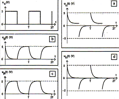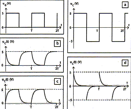 Quelle courbe peut représenter la tension uC aux bornes du condensateur ? La tension aux bornes du condensateur est une fonction continue du temps : courbes a et d éliminées. Quand la tension uG aux bornes du générateur est positive, le condensateur se charge et la tension uC à ses bornes est croissante : courbe b éliminée. réponse : courbe c.