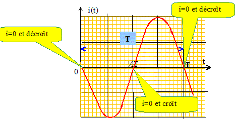 Dipôle LC. Texte : soit un circuit LC, constitué d'une bobine d'inductance L= 0,01 H, de résistance interne négligeable, et d'un condensateur de capacité C = 100 mF, initialement chargé sous une tension E= 10 V. A t=0, on ferme le circuit. Analyse : La période des oscillations de l'intensité du courant circulant dans le circuit est la durée séparant deux dates successives pour lesquelles l'intensité s'annule. Vrai ou faux. Il faudrait ajouter à la phrase précédente " en variant dans le même sens " pour que l'affirmation soit vraie. Réponse : faux.