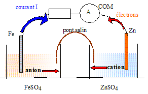 Texte :Soit une pile zinc fer qui met en jeu les couples oxydant / réducteur Zn2+aq/Zn(s) et Fe2+aq/Fe (s). Le pont salin de la pile contient des ions potassium K+ et chlorure Cl-. Cette pile débite dans un circuit série comprenant un ampèremètre et un dipôle ohmique. L'ampèremètre affiche une valeur positive de l'intensité I alors que sa borne COM est reliée à l'électrode de zinc. On considère que l'intensité du courant I est constante. Au bout d'une heure de fonctionnement la masse de l'électrode de fer a augmenté d'une masse m1 = 56 mg. Analyse : Faire un schéma légendé de la pile branchée au circuit extérieur en faisant apparaître le sens de déplacement des porteurs de charges.