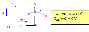 Analyse : Question relative à la valeur de R. La valeur maximale de l'intensité est égale à : i0 = -U0/R avec U0 = 6 V et i0 = -1,4 10-3 A d'où R = 6/1,4 10-3 = 4,3 kW. Question relative à la valeur de C.