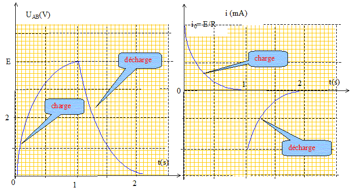 Texte : les courbes ci-dessous représentent l'évolution de la tension u=uc aux bornes du condensateur et de l'intensité du courant dans le circuit.