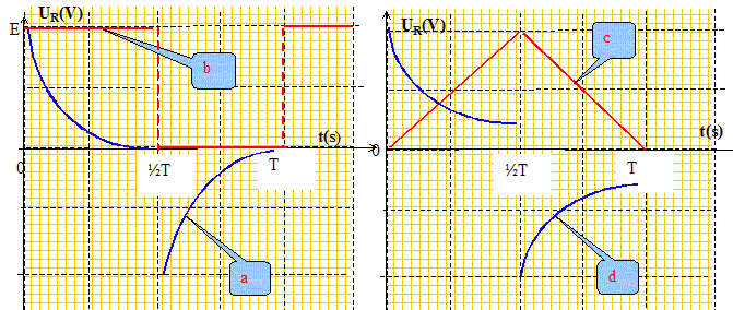 Analyse : Question relative à l'allure de la tension aux bornes du résistor. La tension uR et l'intensité du courant traversant la résistance, sont proportionnelles : les courbes uR = f(t) et I= g(t) ont donc la même allure. De plus lors de la décharge du condensateur à travers la résistance, le courant change de sens. Lors de la charge l'intensité décroît de manière exponentielle. En fin de charge, comme en fin de décharge, l'intensité du courant est nulle. La courbe a possède ces propriétés.