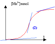 L'ion Mn2+ sert de catalyseur ( autocatalyse) et au début la quantité de catalyseur est nulle. La tangente est pratiquement horizontale : la vitesse est quasiment nulle. La quantité de matière d'ion Mn2+ augmente et en conséquence la vitesse de la réaction. La quantité de matière des réactifs diminue au cours du temps : ce second facteur va faire décroître la vitesse de la réaction au bout d'un temps assez long. Ce phénomène porte le nom d'autocatalyse : l'un des produits de la réaction sert de catalyseur.