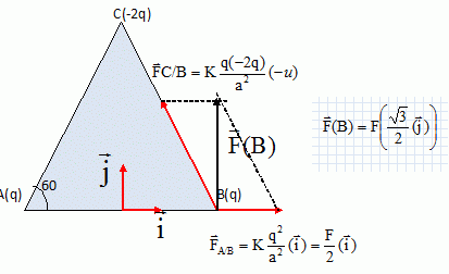 Forces électriques. On dispose de trois charges électriques ponctuelles qA, qB, qC placées aux sommets d'un triangle équilatéral de côté a. qA =qB= q positif ; qC = -2q négative. K = 1 / (4pe0) avec e0 la permittivité du vide. AB = AC = BC = a. La force électrique exercée par qA sur qB est notée FA/B. La force électrique exercée par qC sur qB est notée FC/B.... La résultante des forces électriques exercées sur B est notée F(B). La résultante des forces électriques exercées sur A est notée F(A).... ![]() Etude des forces électriques s'exerçant sur C. Montrer que les forces FA/C et FB/C ont une norme commune que l'on notera F. Exprimer F en fonction de q et a. Représenter ces forces. ![]() Exprimer les composantes de ces vecteurs dans la base ( i, j ).