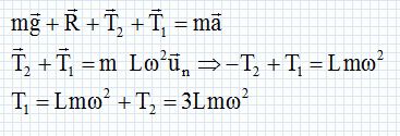 Les deux solides sont attachés par des fils inextensibles de masse négligeable, parallèles à la tige. Le fil 1 entre D et S1 et le fil 2 entre S1 et S2 sont identiques et ont une longueur L. ![]() Etude du solide S2. Donner la nature du mouvement de S2 et les caractéristiques de sont vecteur accélération. Exprimer ce dernier dans la base de Frenet en fonction des données. S2 est animé d'un mouvement circulaire uniforme à la vitesse angulaire w. L'accélération est horizontale, centripète, de valeur 2Lw2. ![]() Quelles sont les forces appliquées à S2 ? Les représenter. Le poids de S2, vertical, vers le bas, valeur mg L'action de la tige, opposée au poids et la tension du fil T2.