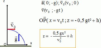 Lors du vol horizontal, rectiligne, uniforme, à l'altitude h et à la vitesse v0, un petit objet ( sur lequel on peut négliger l'influence de la résistance de l'air ) se détache du dessous de l'avion. Etablir les équations du mouvement de l'objet par rapport à un référentiel terrestre. Donner l'équation de sa trajectoire et représenter son allure. Dans le référentiel lié terrestre, l'objet est en chute libre avec une vitesse initiale horizontale v0. : ![]() Mêmes questions par rapport à un référentiel lié à l'avion. Chute libre verticale sans vitesse initiale. z = -0,5 t2 +h ; v = gt. La trajectoire est une droite.