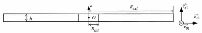 vertical ascendant. La vitesse angulaire est notée W. Dans cette question, le CD-ROM est modélisé par un cylindre homogène en polycarbonate de hauteur h = 1,20 mm, de rayon Rext = 6,00 cm, percé en son centre d'un trou circulaire de rayon Rint = 7,50 mm. Sa masse volumique est µ =1,20 103 kg m-3. Soit R1 le référentiel lié au disque. On lui associe un repère orthonormé direct ( O, x1, y1, z1), l'axe Oz1 étant confondu avec l'axe Oz. On note la base vectorielle des coordonnées cylindriques permettant de repérer un point dans R1. Dans le cas où R1 est animé d'un mouvement de rotation uniforme par rapport à R0 autour de l'axe Oz, on admet que l'accélértion d'inertie d'entraînement d'un point M s'écrit :