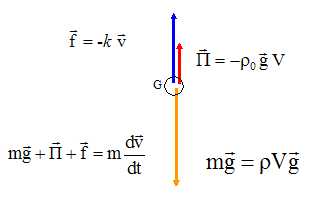L'hématie est soumise à son poids, à la poussée d'Archimède et à la force de frottement fluide. On note V= 4/3 pR3, le volume d'une hématie.