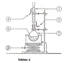 1 : réfrigérant ; 2 : ballon ( contenant les réactifs et les produits) ; 3 : élévateur à croisillons ; 4 : sortie de l'eau ; 5 : entrée de l'eau : 6 : pierre ponce nom et les caractéristiques de cette réaction : estérification, lente athermique, limitée par l'hydrolyse de l'ester. on chauffe pour accélérer la réaction chimique. nom du composé organique obtenu (ester) : éthanoate de pentyle. équation chimique de la réaction si on remplace le pentan-1-ol par le propan-1-ol : CH3-CO2H + CH3-(CH2)2-OH= CH3-CO2-(CH2)2-CH3 + H2O.