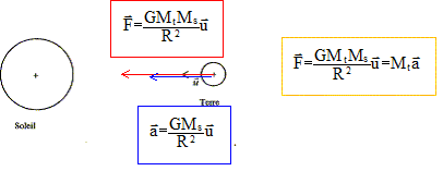 L'accélération est centripète, dirigée vers le centre du soleil, sa valeur est : a = GMs/R2. Le mouvement est circulaire uniforme. Relation entre l'accélération a et la vitesse v du centre d'inertie de la Terre autour du Soleil : a = v2/R. v : vitesse en m/s et R (m) rayon de l'orbite circulaire. Valeur de cette vitesse : a = GMs/R2 = v2/R d'où v2 = GMs/R ; v = [GMs/R]½. v = [6,67.10-11*1,98.1030 / 1,50 1011]½ =2,97 104 m/s. Expression de la période de rotation T de la Terre autour du Soleil en fonction de la vitesse v et du rayon R de sa trajectoire : Durée (s) nécessaire pour décrire une circonférence ( 2pR en mètre) à la vitesse v ( m/s) définie ci-dessus. 2pR = v T ; T= 2pR / v. Expression de T en fonction de G, Ms et R : Elever au carré l'expression de la période : T2 = 4p2 R 2 / v2. Remplacer v2 par son expression GMs/ R: T2 = 4p2 R 3 / (GMs). T = 2p[R 3 / (GMs)]½. Calcul de la période T : [GMs]½ =[ 6,67.10-11 *1,98.1030]½ =1,1492 1010. R3/2 =( 1,50 1011)3/2 =5,81 1016. T = 6,28*5,81 1016/1,1492 1010=3,17 107 s.