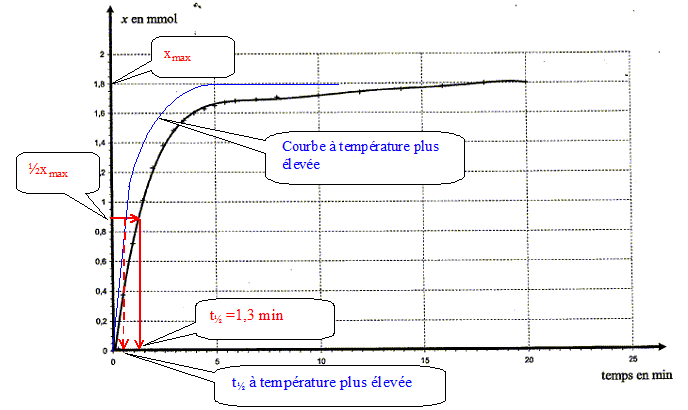 Le facteur cinétique permettant de justifier de cette évolution est la concentration du réactif : au cours du temps celle-ci diminue et en conséquence la vitesse diminue. Temps de demi-réaction et estimation graphique de sa valeur : Durée au bout de laquelle l'avancement est égal à la moitié de l'avancement final. Ici xfin = xmax = 1,8 10-3 mol donc xt½ = ½xmax= 9,0 10-4 mol.