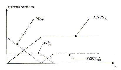 - une diminution de la quantité de matière d'ion Ag+(aq) - que la quantité de matière d'ion Fe3+(aq) reste constante. Après l'équivalence, le graphe montre que : - la quantité de matière d'ion Ag+(aq) est nulle - la quantité de matière d'ion Fe3+(aq) diminue. Les réactions (a) et (b) ne se déroulent pas simultanément : la réaction (a) se déroule en premier. L'équivalence de ce dosage est repérée par l'apparition de la couleur rouge sang due à l'ion FeSCN2+(aq). Ce titrage se déroule en une seule étape :