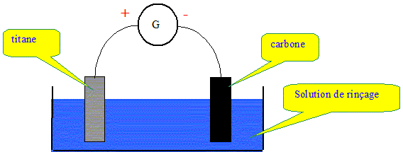 On s'intéresse ici à une technique électrochimique qui vise à respecter la teneur officielle en cuivre dissous dans les effluents qui résultent d'opérations de rinçage. Le second rinçage s'effectue en circuit fermé. Les eaux de rinçage sont envoyées sur des cellules d'électrodéposition fonctionnant en continu, qui permettent la réutilisation de ces eaux ultérieures. La cuve à électrodéposition contient une électrode en titane et une électrode en carbone. Ces deux électrodes sont immergées dans la solution de rinçage et sont alimentées par un générateur de courant continu comme le montre le schéma suivant :