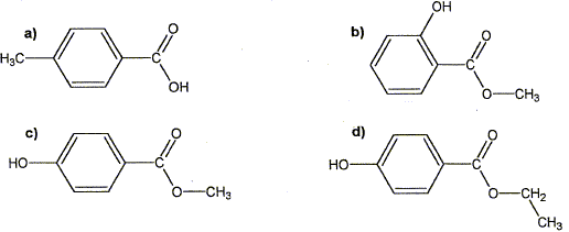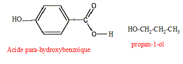 Les cosmétiques sont des produits d'hygiène et d'embellissement du corps humain. Ils sont de plus en plus nombreux dans nos salles de bain. On classe dans les cosmétiques, les produits de soin, de maquillage, de rasage, des produits capillaires, solaires, des parfums... Un cosmétique contient plusieurs ingrédients dont un ou plusieurs principes actifs, un excipient et des additifs. L'emballage d'un produit cosmétique doit comporter la liste complète des ingédients. Dans cet exercice on se propose d'étudier quelques composants des produits cosmétiques. Les parabènes : Les parabènes ( paraben en anglais) sont des conservateurs utilisés dans l'industrie cosmétique pour empécher la prolifération des bactéris et des champignons. On les trouve dans bon nombre de produits de beauté : shampoings, gels douches, crèmeshydratantes....Les parabènes les plus courants sont : le méthylparaben, l'éthylparaben, le propylparaben et le buthylparaben. La formule semi-développée du propylparaben ou parahydroxybenzoate de propyle est :
