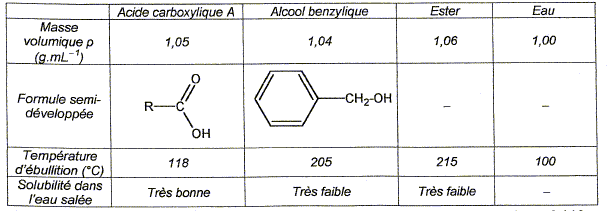 Un professeur décide de faire synthétiser à ses élèves un ester utilisé en parfumerie. Chaque binôme dispose d'un flacon A contenant un acide carboxylique noté R-COOH et d'un flacon B contenant l'étiquette alcool benzilique C6H5-CH2OH. A est soit l'acide méthanoïque, soit l'acide éthanoïque, soit l'acide propanoïque. Recherche de l'acide utilisé : Chque binôme dispose d'une solution S obtenue en dissolvant une masse m = 0,90 g d'acide carboxylique A dans une fiole jaugée de 1000 mL les élèves placent dans un becher un volume VA = 10,0 mL de la solution S. Ils placent dans une burette graduée une solution aqueuse d'hydroxyde de sodium ( Na+(aq) + HO-(aq)) de concentration molaire en soluté apporté cB= 1,0 10-2 mol/L et ils réalisent un dosage pH-métrique.